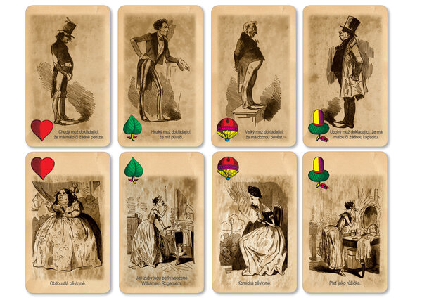 Námět karet vychází z francouzských vtipů na tapetách v dětském pokoji na Frýdlantě (poslední třetina 19. stol.). Motivem karet s hodnotou krále jsou dobové karikatury hraběte Eduarda Clam-Gallase, esa pak představují rodová sídla.