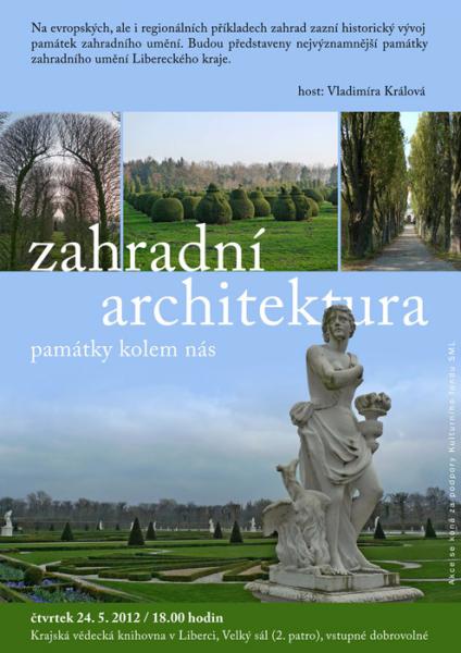 Ve čtvrtek 24. května 2012 v 18 hodin se v Krajské vědecké knihovně v Liberci uskutečnila přednáška Mgr. Vladimíry Králové věnovaná zahradní architektuře nejen v Libereckém kraji. Přednáška se konala v rámci pravidelného cyklu Památky kolem nás ve Velkém sále Krajské vědecké knihovny. Byla poslední před letními prázdninami, na další cyklus přednášek se můžete těšit opět od září.