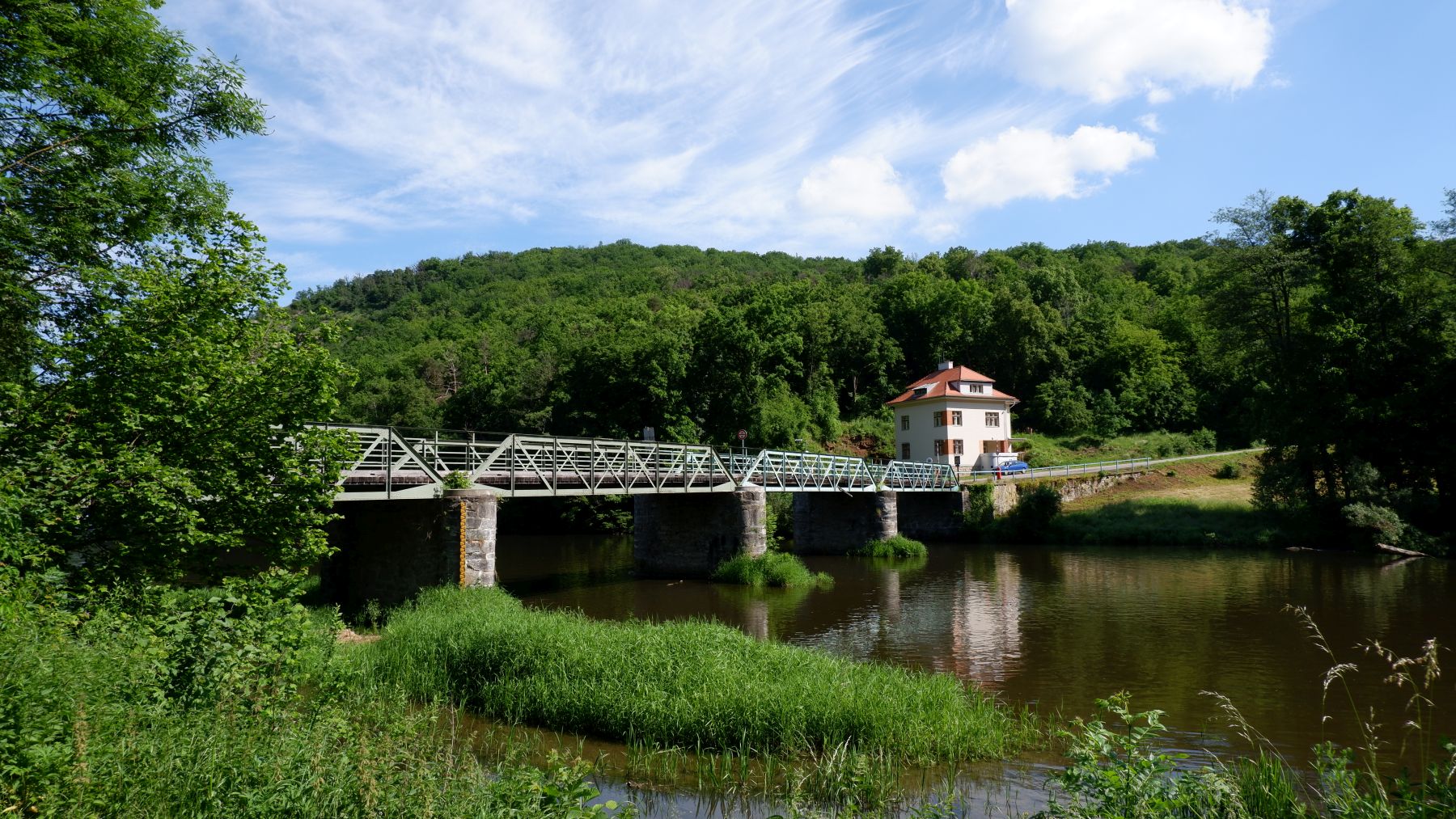 Obě stavby, důvěrně známé všem návštěvníkům Národního parku Podyjí se díky pohnutým dějinám okolní krajiny dochovaly v podobě, jakou získaly během prvních desetiletí 20. století. Most, tvořený ocelovou příhradovou konstrukcí, spočívající na pěti zděných kamenných pilířích, nahradil původní dřevěnou lávku v roce 1885. Železnou konstrukci vytvořila renomovaná vídeňská firma Ignaze Grindla, z jejíž projekční kanceláře vyšel například také skelet palmového skleníku v Schönbrunnu. V nezměněné podobě sloužil most svému účelu i po rozpadu monarchie do poloviny třicátých let 20. století, kdy zde ohrožený československý stát vybudoval tři menší pevnostní objekty vzor 37 a roku 1937 stanici finanční stráže, rovněž opatřenou lehkou fortifikací. Po anšlusu Rakouska nacistickým Německem byl přechod přes řeku Dyji zatarasen závorami a na českých loukách vznikly nepřístupné protitankové bariéry. Kvůli napjaté situaci v roce 1938 byl most podminován, což ovšem na přelomu září a října nezabránilo ozbrojeným složkám Freikorps k několika ozbrojeným útokům. Přepady přes Dyji byly ovšem vždy odraženy československými obránci pod velením strážmistra Karla Tojšla.